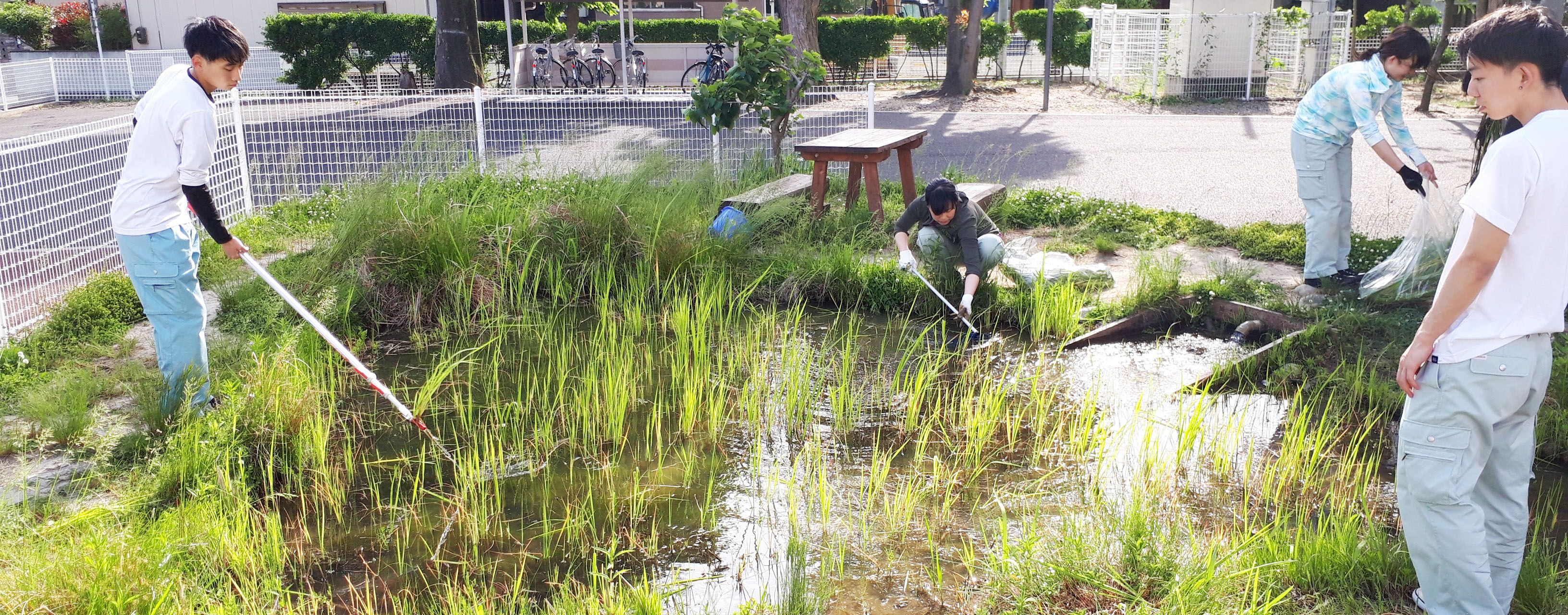 地域の野生生物の生息空間であるビオトープ池の施工と管理を行います。本校の弁天橋実習場のビオトープのほか、市内の小学校へ出張してビオトープの施工・管理のほか、環境教育も行います。