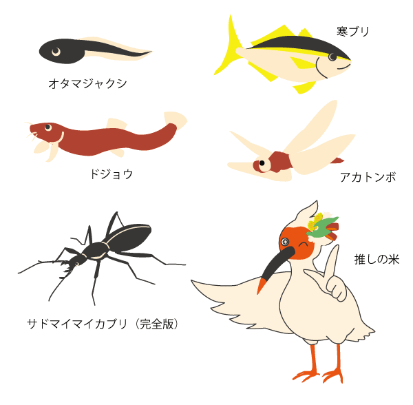 サドマイマイカブリは、島民の方はご存じないかもしれませんが、昆虫愛好者からするとかなり有名な昆虫で、サドマイマイカブリのために佐渡に訪れる愛好家の方がいるほどです。本校の昆虫好きの学生もあこがれの存在です。また、稲を植えやすいよう、触角や足の一部を省略しました。